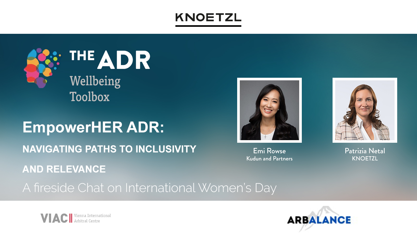 On International Women’s Day, KNOETZL partner Patrizia Netal took part in a fireside chat with Emi Rowse Igusa, Partner and Head of Japan Practice at Kudun and Partners that was organized by the ADR Wellbeing Toolbox, a co-creation of ARBalance and VIAC.