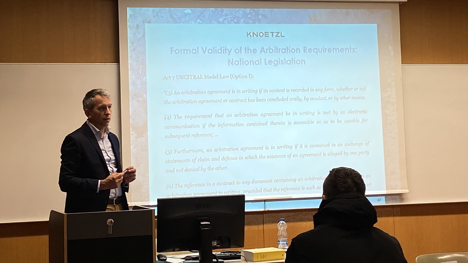 We at KNOETZL take pride in sharing our knowledge and experience with the new generation of lawyers. On Wednesday, 18 October 2023, Florian Haugeneder lectured at the University of Vienna on the topic of arbitration clause, as part of the annual International Commercial Arbitration series of the law faculty. The lecture was attended by young arbitration enthusiasts who engaged in a lively discussion.