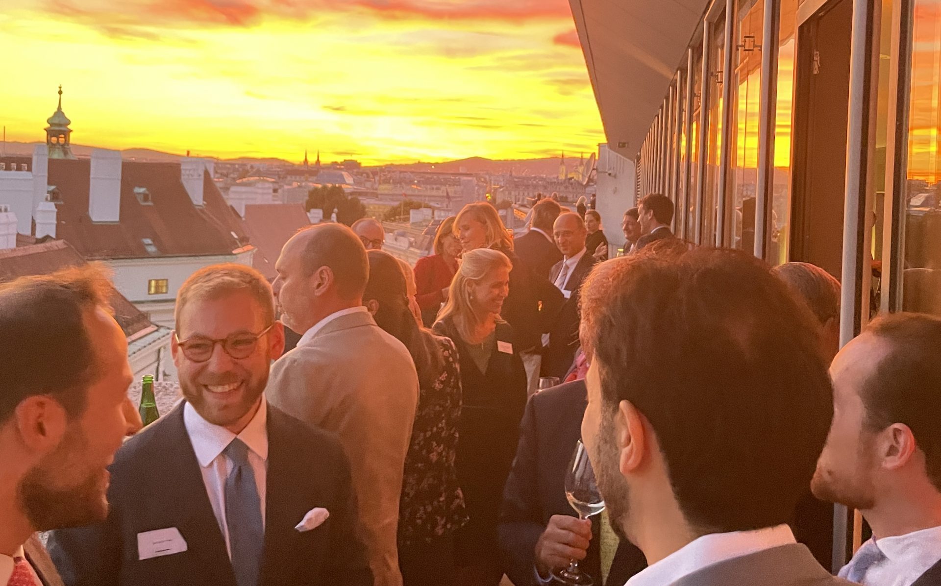 The hatchet that KNOETZL’s clients so often like for us to wield for their fights was buried last Thursday, but our customary passion and energy continued, unabated. Just in time for the beginning of autumn, we duly bid farewell to summer 2021 with a circle of friends and many of our valued, loyal clients and business partners in the delicious rays of the spectacular evening sun.  Fueled by inspiring refreshments, epicurean delights of the finest grade, and a feast for the ears produced live by our favorite jazz musicians of the Storyville Band, we found ourselves as close to Seventh Heaven as we are allowed. As was ordained, the evening presented itself in full color splendor, while we bid adieu to the summer of 2021 — and hopefully to the worst of the loathsome pandemic. There were enough good signs: The weather couldn’t have been nicer, our health-checked, brilliant and eclectic guests couldn’t have been in a better mood and the atmosphere couldn’t have been warmer and more pleasant. We would like to thank all our guests for their contribution to the cozy, late summer evening on our beautiful skytop terrace with early autumn’s breathtaking sunset over the Wiener Hausberge and the city’s own Eastern hills of the fabled Wienerwald to our West.